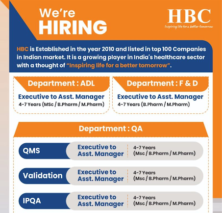 5 HBC Healthcare Pharma Jobs in Gujarat 2025 : Explore exciting pharma job opportunities at HBC Healthcare Pvt Ltd in Gujarat. Hiring for Executive to Assistant Manager roles in QA, QMS, Validation, IPQA, ADL & F&D. Apply now if you have 4–7 years of experience and OSD exposure!