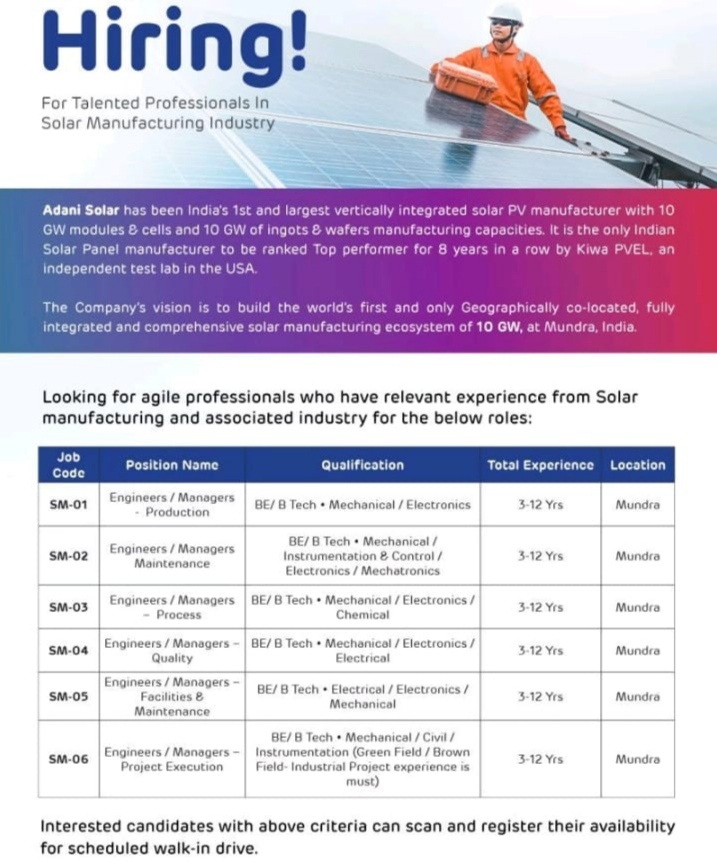 Adani Solar is looking for engineers and managers with relevant experience in solar manufacturing and associated industries. If you have expertise in production, process, quality, maintenance, or project execution, then this is the right platform for you to grow your career.