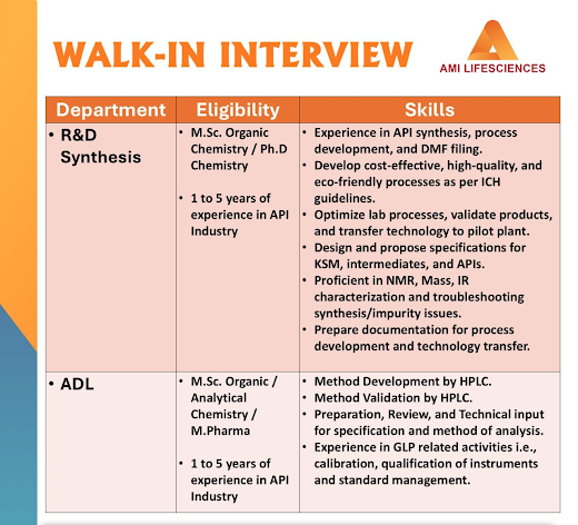 AMI Lifesciences Walk-In Interview 2025 is a great opportunity for candidates seeking growth in the pharmaceutical sector. The Walk-In Interview in Vadodara will be conducted on 7th September 2025, offering multiple openings in R&D and ADL departments. Through AMI Lifesciences Hiring 2025, professionals can explore rewarding careers in the API industry. Exciting roles are available for those looking for R&D Synthesis Jobs in Gujarat as well as ADL Jobs in Vadodara, making this the perfect chance to secure a future in one of the fastest-growing API industry jobs in Gujarat.