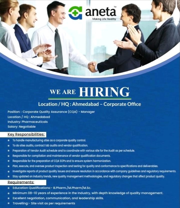 Aneta Pharmaceuticals Hiring 2025 : Are you looking for Pharma jobs in Ahmedabad with a reputed organization? Aneta Pharmaceuticals, a leading name in the pharmaceutical industry, is hiring for the position of Corporate Quality Assurance (CQA) – Manager at its Ahmedabad Corporate Office. This is an excellent opportunity for experienced professionals who want to advance their careers in quality management in pharmaceuticals.