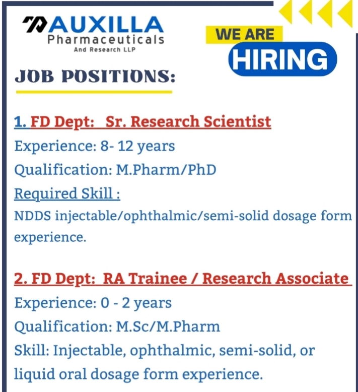 Auxilla Pharmaceuticals Jobs October 2025 ! Explore exciting career opportunities in the FD Department for Sr. Research Scientist and RA Trainee/Research Associate roles. Apply today and join a dynamic pharmaceutical R&D team.
