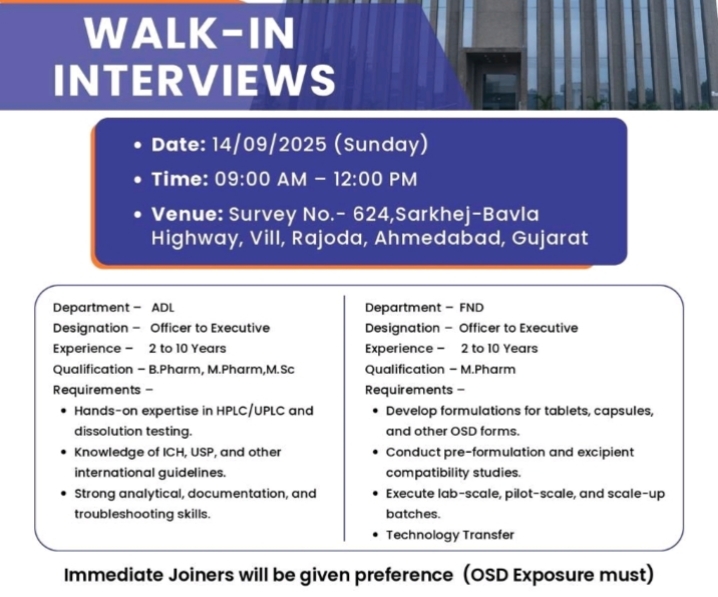 This walk-in interview is exclusively designed for pharma professionals who are seeking career opportunities in Analytical Development Laboratory (ADL) and Formulation & Development (FND) departments.