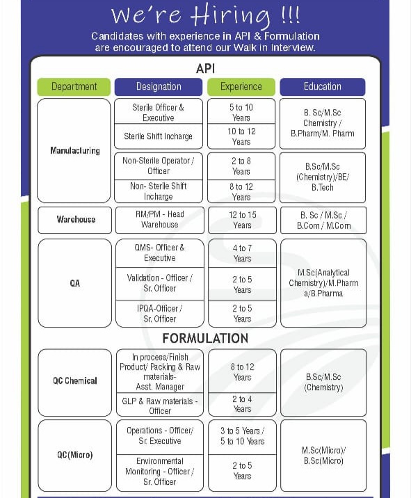 • Non-Sterile Shift Incharge: 8–12 years of experience; Qualification: B.Sc / M.Sc (Chemistry) / BE / B.Tech