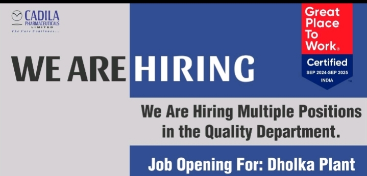 Cadila Pharmaceuticals Vacancy 2025 : Exciting Career Opportunities in the Quality Department – Apply Now! Are you looking to take the next step in your pharmaceutical career? Cadila Pharmaceuticals, a name synonymous with innovation, quality, and excellence in the healthcare industry, is hiring for multiple positions at its Dholka Plant in the Quality Control (QC) and Quality Assurance (QA) departments.