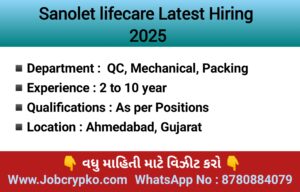 Sanolet lifecare Latest Hiring 2025 for QC, Mechanical, Packing Department at Ahmedabad