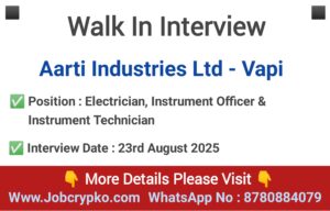 Aarti Industries Walk In Interview 2025 On 23rd August 2025 For Electrician, Instrument Officer & Instrument Technician Positions at Vapi Location. 1. Latest Job Vacancy in Aarti Industries …