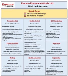 Emcure Pharma Walk-In Interview 2025 – Multiple Openings in Production, QC, QA, Packing, Engineering & Warehouse