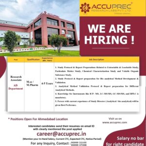 Accuprec Research Labs Latest Job 2025 for Research Associate (AD Department) & Research Associate (Formulation & Development) Department at Ahmedabad Location. 1. Job Vacancy in Accuprec Research Labs …