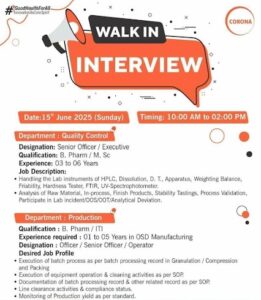 Corona Remedies Walk In Interview 2025 on 15th June 2025 For QC & Production Department at Ahmedabad. 1. Job Vacancy in Corona Remedies Walk in Interview 2025 2. …