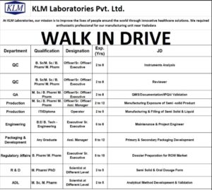 KLM Laboratories Walk in Interview 2025 on 22nd June 2025 for QA, QC, Production, Engineering, R&D, ADL, RA, Packing & Development Department at Vadodara location. 1. Latest Job …