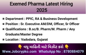 Exemed Pharma Latest Hiring 2025 for PPIC, RA & Business Development Department at Vadodara Location. 1. Job Vacancy in Exemed Pharma Latest Hiring 2025 2. How to Apply …