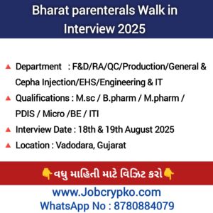 Bharat parenterals Walk in Interview 2025 On 18th & 19th August 2025 For F&d/RA/QC/Production/General & Cepha Injection/EHS/Engineering & IT department at Vadodara Location. 1. Vacancy Details in Bharat …