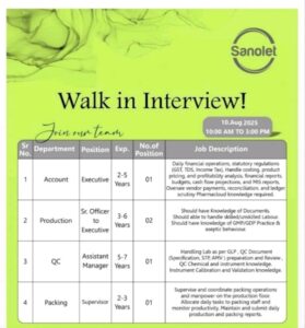 Sanolet Lifecare Job Openings 2025 have been announced looking for experienced candidates in Dry Powder Injection (DPI) manufacturing for multiple departments including Production, QC, Engineering, Packing, and QC …