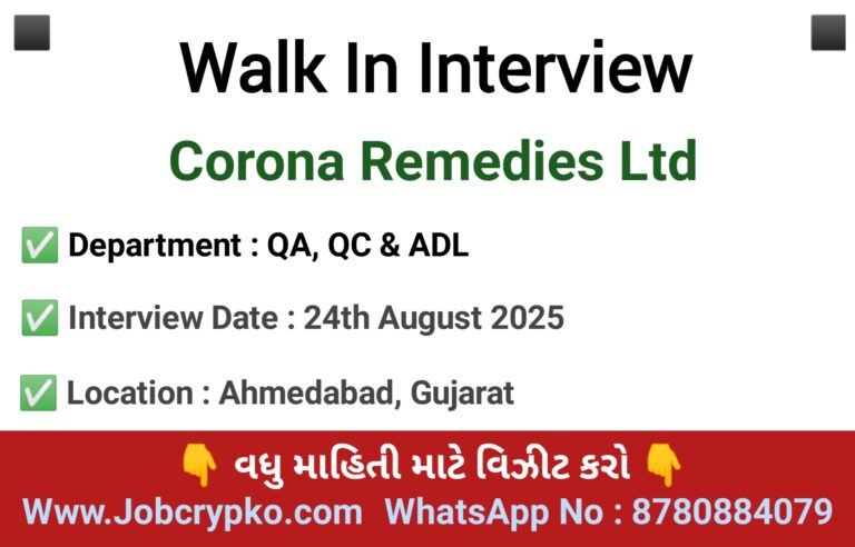 Corona Remedies Walk In Interview 2025 Conduct on 24th August 2025 at Ahmedabad Location.