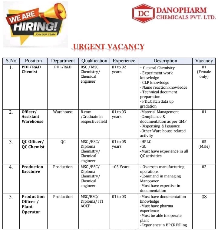 Danopharm Chemicals is one of the leading pharma companies in Gujarat, offering excellent career growth, competitive opportunities, and exposure to advanced chemical and pharmaceutical practices. With immediate joining preference, this is the right time to grab your chance at building a rewarding career in the pharma industry.