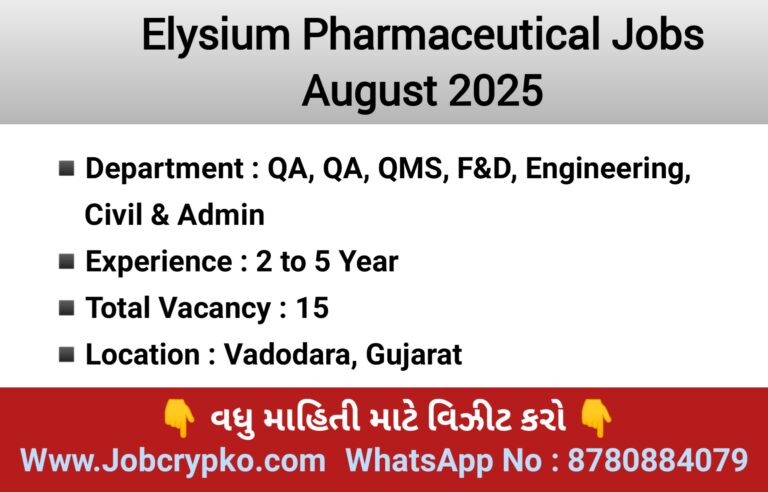 Elysium Pharmaceutical Jobs August 2025 For QA, QA, QMS, F&D, Engineering, Civil & Admin Department at Vadodara Location.