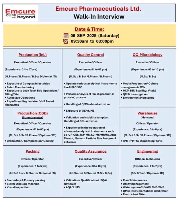 Emcure Pharma Walk-In Interview 2025 : Are you looking to build a successful career in the pharmaceutical industry? Here’s an excellent opportunity to join one of India’s leading pharma companies. Emcure Pharmaceuticals Ltd. is conducting a Walk-In Interview on 6th September 2025 (Saturday) for multiple positions across departments including Production (Injectables & OSD), Quality Control, QC-Microbiology, Packing, Quality Assurance, Engineering, and Warehouse.