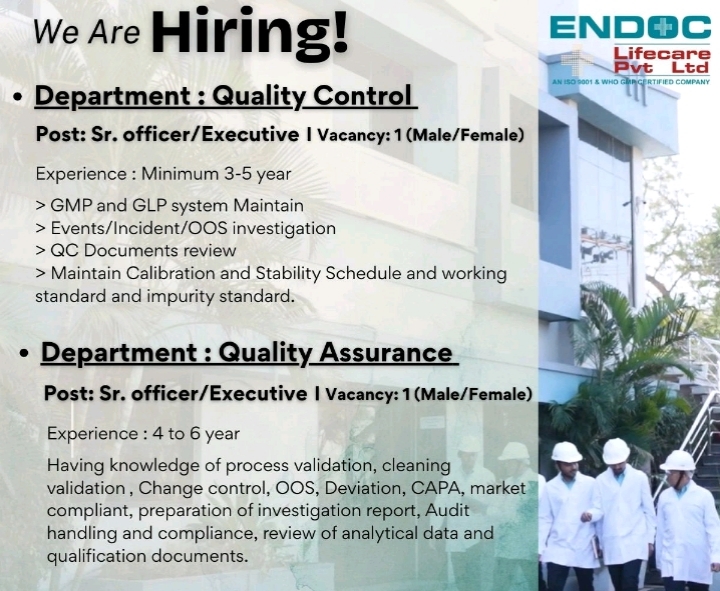 Endoc Lifecare Pvt Ltd, a reputed ISO 9001 & WHO certified pharmaceutical company, is inviting applications for exciting career opportunities in Quality Control (QC) and Quality Assurance (QA) departments. If you are looking for pharma jobs in Rajkot Gujarat, this is the perfect chance to join a growing organization and enhance your professional career.