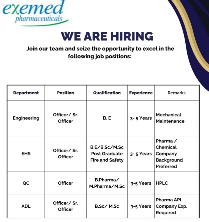 If you are looking for a rewarding career in the pharmaceutical manufacturing sector, this is your chance! Exemed Pharmaceuticals, a reputed name in the pharma industry, has announced exciting job openings for skilled professionals across multiple departments. The company is seeking qualified candidates for positions such as Officer and Senior Officer in Engineering, QC, ADL, and EHS departments.