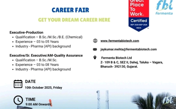 Fermenta Biotech Ltd Career Fair 2025 Attend in Dahej on 10th October! Explore opportunities for Executive, Senior Executive, and Assistant Manager roles in Production and Quality Assurance (Pharma API). Learn more and join your dream career with one of India’s top certified workplaces.