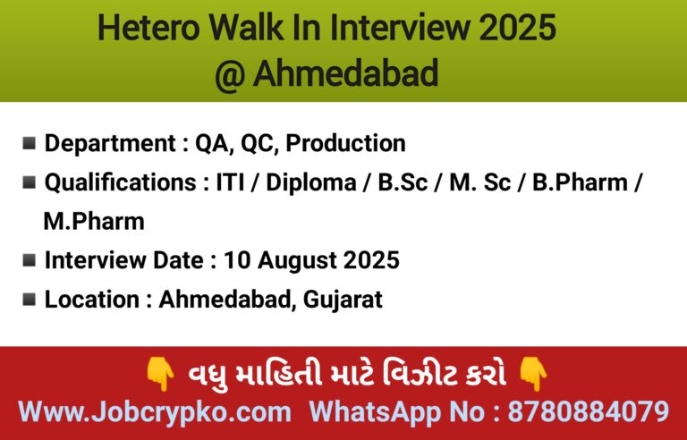 Hetero Walk In Interview 2025 On 10 Aug 2025 for ITI / Diploma / B.Sc / M. Sc / B.Pharm / M.Pharm Candidate at Ahmedabad Location.