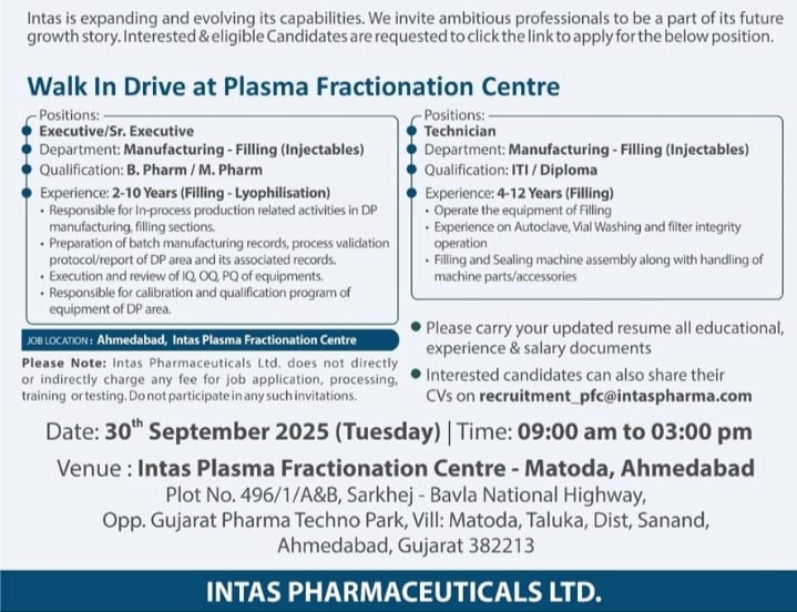 📍 Job Location: Intas Plasma Fractionation Centre, Matoda, Ahmedabad, Gujarat.