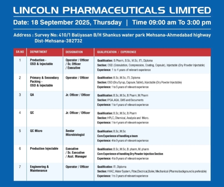 Lincoln Pharma Walk-in Interview 2025 : Attend the Lincoln Pharmaceuticals Limited Walk-in Interview on 18th September 2025 at Mehsana, Gujarat. Explore multiple pharma job openings in Production, QA, QC, Packing, Microbiology, and Engineering departments. Apply now and grow your career with Lincoln Pharma.