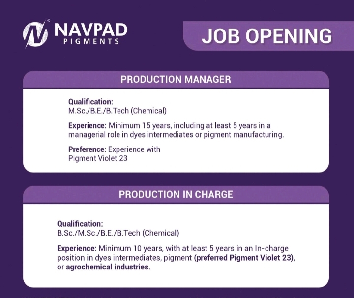 Navpad Pigments Job 2025 : Navpad Pigments is excited to announce new job openings for Production Manager and Production In Charge roles. If you have a background in chemical engineering and experience in dye intermediates or pigment manufacturing, this could be the perfect opportunity for you. Read on to learn more about the qualifications, experience, and how to apply.