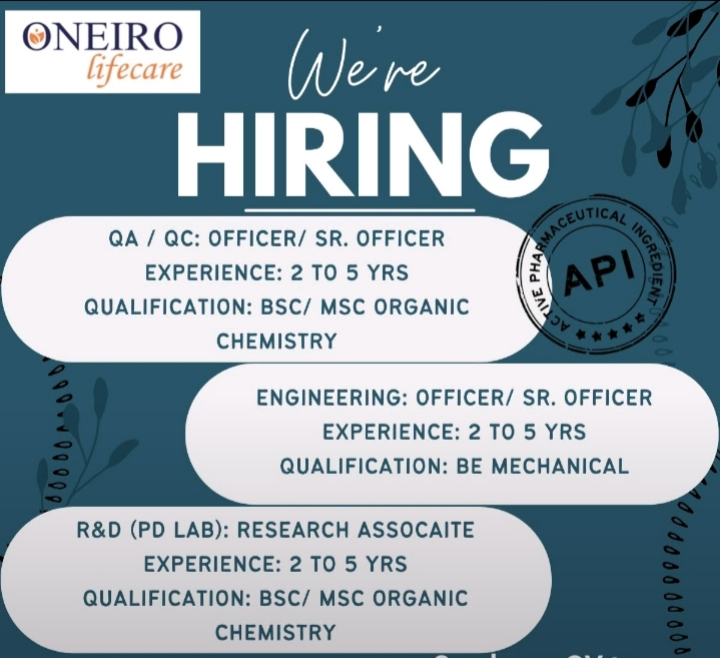 Oneiro Lifecare Hiring 2025 – Apply now for QA/QC Officer, Engineering Officer and R&D Research Associate jobs in Gujarat. Pharma API vacancies for BSc/MSc Organic Chemistry & BE Mechanical candidates.