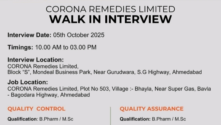 Quality Control & Quality Assurance Jobs in Ahmedabad – Corona Remedies Limited Walk-in Interview on 5th October 2025. Apply with B.Pharm / M.Sc qualification, 4-8 years experience.