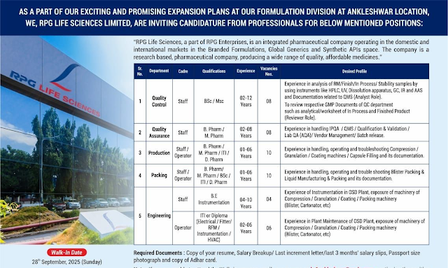 RPG Life Sciences Limited, a renowned name in the Indian and global pharmaceutical industry, is conducting a Walk-In Interview in Ankleshwar on 28th September 2025 (Sunday). This recruitment drive is part of the company’s expansion plans at its state-of-the-art Formulation Division. The company is inviting talented and experienced professionals for multiple positions across Quality Control, Quality Assurance, Production, Packing, and Engineering departments.