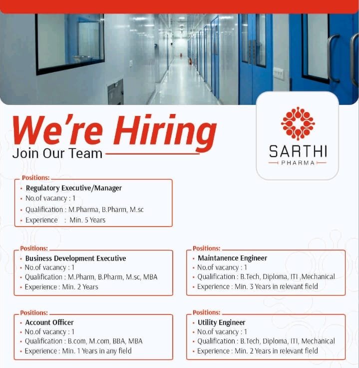 Sarthi Pharma offers a professional work environment, opportunities for career growth, and a platform to showcase your skills in the fast-growing pharmaceutical industry. Whether you are an experienced professional in Regulatory Affairs, Business Development, Engineering, or Accounts, this is your chance to join a reputed pharma company in Gujarat.