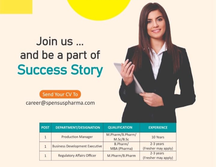 Spensuss Pharma Hiring 2025 : Discover top pharma job openings at Spensuss Pharmaceuticals in Mehsana, Gujarat. We’re hiring for Production Manager (10+ years exp), Business Development Executive (freshers welcome), and Regulatory Affairs Officer.