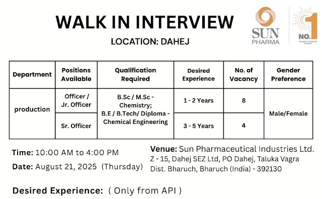 Sun Pharma Walk-In Interview 2025 For B.Sc / M.Sc (Chemistry) or B.E / B.Tech / Diploma (Chemical Engineering) Qualifications male & Female Candidate.