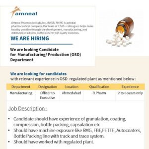 Amneal Pharma Latest Job 2025 for Manufacturing/Production (OSD) Department at Ahmedabad Gujarat location. 1. Job Vacancy in Amneal Pharma Latest Job 2025 2. How to Apply in Amneal …