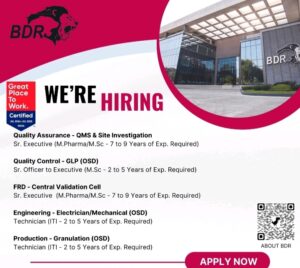 BDR Pharma Job Opportunity 2025 for QA, QC, Engineering , Production , FRD department position at Luna, Padra (Gujarat) Location. 1. Job Vacancy in BDR Pharma Job Opportunity …
