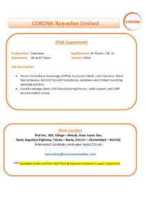 Corona Remedies Latest Job 2025 For IPQA Department at Ahmedabad Location. 1. Job Vacancy in Corona Remedies Latest Job 2025 Requirements: Candidates from OSD plant background with a …