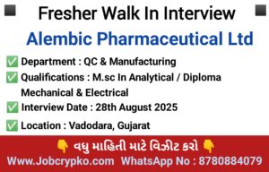 Intas Pharmaceuticals Walk-In Interview 2025 – Hiring for Manufacturing & Technician Jobs in Ahmedabad. B. Pharm, M. Pharm, ITI, Diploma candidates can apply. Attend on 30th September 2025. …