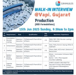Granules India Walk in Interview 2025 on 15th June 2025 for OSD formulations, specifically in areas like granulation, compression, coating, packing, and capsule filling at Vapi Location. 1. …