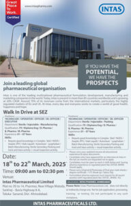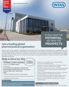 1050 Intas Pharmaceuticals jobs in Ahmedabad ! A walk-in drive will be held on 1st November 2025 at the Matoda facility, with multiple openings in QA, QC, Microbiology, …