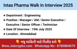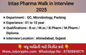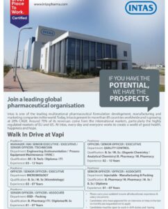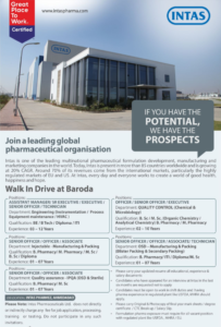 Intas Pharma Walk In Interview 2025 Conduct on 30 August 2025 For B. Pharmacy/M Pharmacy / Msc/Bsc/BE /Diploma/ITI Qualifications candidates at Ahmedabad Location. 1. Latest Job Vacancy in …