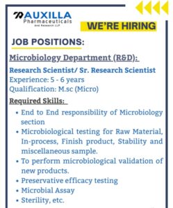 AUXILLA Pharma Hiring 2025 for Microbiology Department at Sanand – Ahmedabad location. AUXILLA PHARMACEUTICALS AND RESEARCH LLP is located in Ahmedabad, Gujarat, India and is part of the …