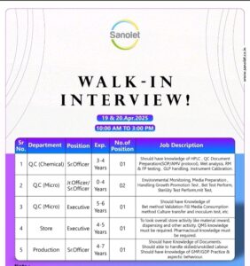 Sanolet Walk In Interview 2025 For QC Chemical/ QC Micro/ Store/ Production Dept Ahmedabad Gujarat location. 1. Vacancy Details in Sanolet Walk In Interview 2025 Perks: 2. Sanolet …