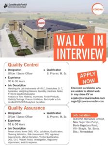 Corona Remedis Ltd walk in interview for Quality Control and Quality Ansurance Department on 6th April 2025 at Ahmedabad location. 1. Vacancy Details : (Latest Job) in Corona …