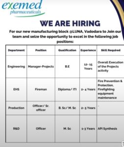 Exemed Pharmaceuticals has announced the latest job openings in Engineering, EHS, Production, and R&D departments at its Vadodara location. 1. Vacancy Details: Exemed Pharmaceutical (Latest Job) 2025 🌑 …