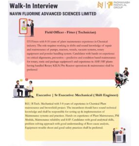 Navin Fluorine Advance Science Walk In Interview 2025 for Field Officer – Fitter (Technician) & Executive | Sr. Executive: Mechanical (Shift Engineer) at Bharuch Location. 1. Job vacancy …