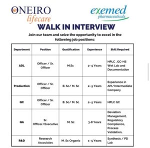 Oneiro Lifecare Walk in Interview held on 23 March 2025 for ADL, QC, QA, Production and R&D Department. 1. Vacancy Details : Oneiro Lifecare Recruitment 2025 We’re hiring …
