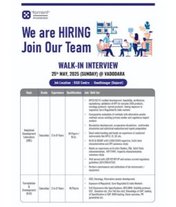 Torrent Pharma Walk In Interview 2025 for Analytical Development Laboratory (ADL) and Formulation & Development (FnD) at Vadodara location. 1. Latest job opening in Torrent Pharma Walk In …