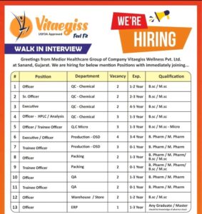 Vitaegiss Wellness Walk In interview 2025 on 04, 05, 06 June 2025 for QC – Chemical, Q.C Micro, Production – OSD, Packing, QA, Warehouse / Store, ERP Department …