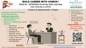 Bharat Biotech Walk-In Interview 2025 in Ankleshwar on 06 September 2025 for freshers & experienced candidates in formulation, vaccine, and sterile drug manufacturing. Apply now for pharma jobs …